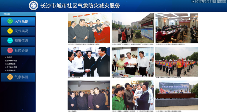长沙社区气象触摸屏是中国气象走进社区,为社区提供专业气象服务的标杆试点工程,得到长沙市委市政府、市人大领导的参观认可,系统平台包括都市天气、气象产品、社区服务三大版块,提供气象预报、雷达图、云图、环境气象、指数气象、交通气象等社区气象服务产品。触摸屏端主要实现气象预警、天气实况、天气预报、服务产品、气象指南及社区服务等信息内容的查询展示功能。